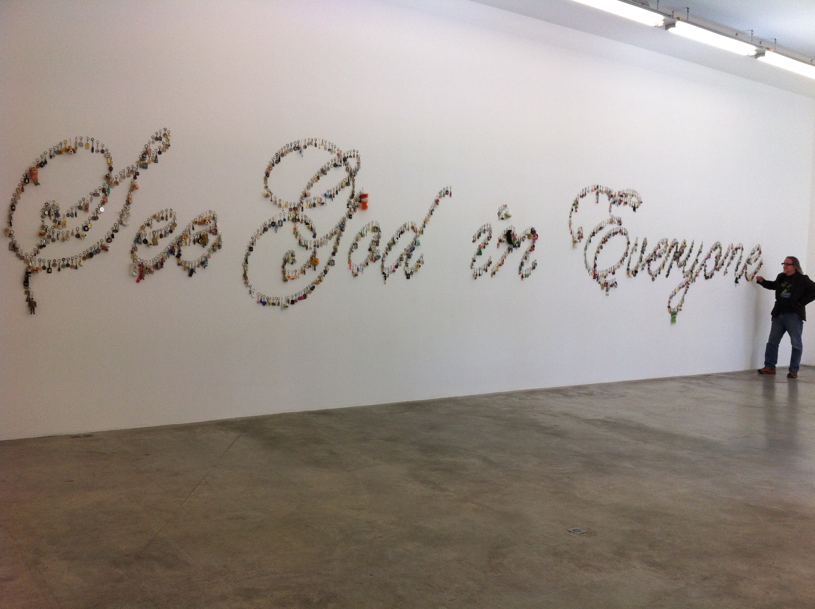 I dropped in one of my favorite galleries this week on a whim…the Galerie Perrotin, where I was blown away by the “Fire of Joy” expo by Iranian artist, Farhad Moshiri. In the largest room he placed two enormous and overtly-spiritual works of art. On one wall, he “wrote” with dangling key chains (of all things) the phrase “See God in Everyone.” I’ve been pondering this phrase for the past few days, so the artist hit his mark with me. It is such a beautiful, yet utterly simple phrase. The phrase alone scrawled along the wall would be enough, but written in keychains…each one with its own, unique little dangling trinket…well, you should be able to connect the dots on that.