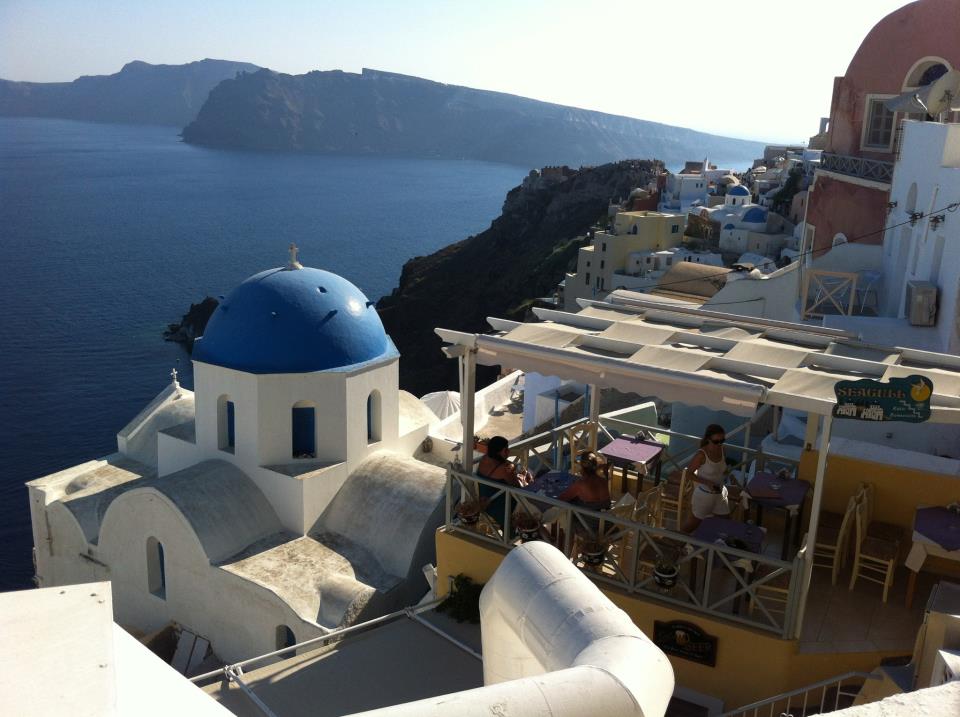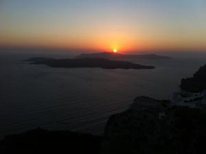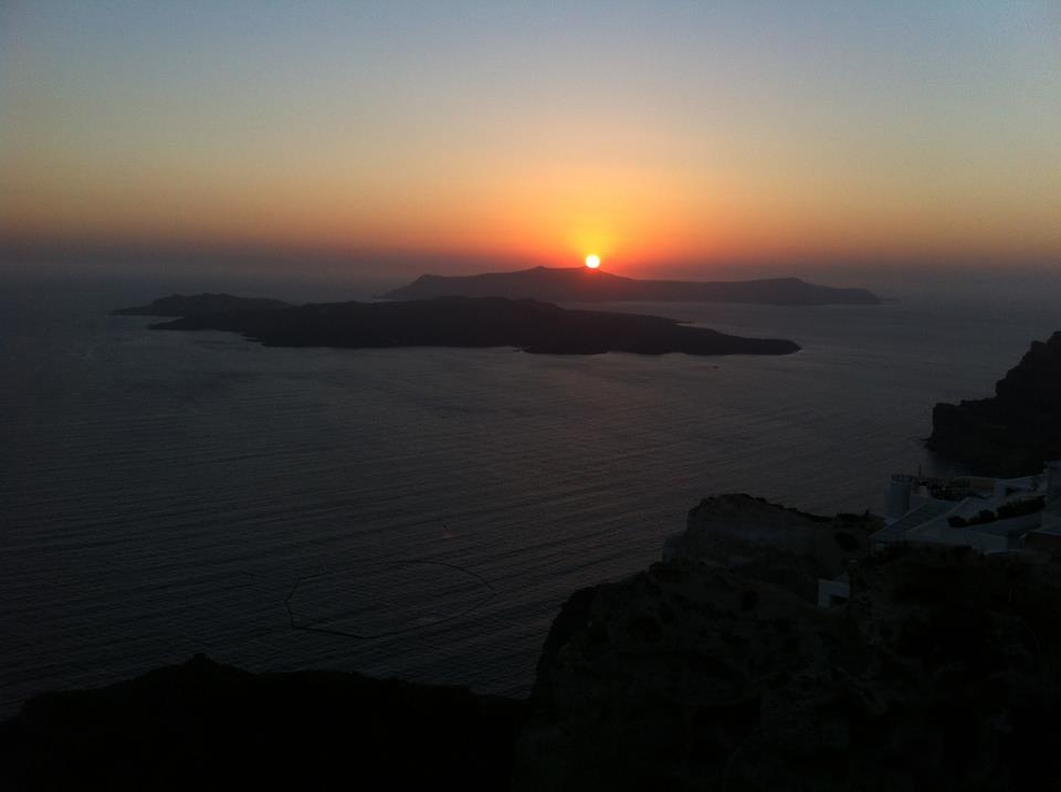 A few days ago I was sipping my morning coffee in the shade of pink bougainvillea while gazing into the enormous crater of a water-filled volcano. The night before I had seen a spectacular sunset from that very chair, and a few hours earlier I had watched the sun peek over the eastern horizon from my room. This was Santorini, Greece.