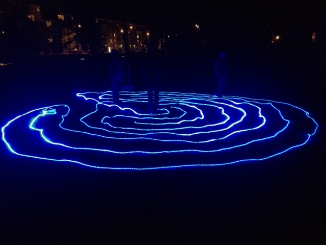 On Sunday night we christened the new lights with a labyrinth in the Museumplein, the large grassy area between the RijksMuseum, the Van Gogh Museum and the famous music hall, the Concertgebouw. Since the lights had never been unrolled from their spools, they were a bit unruly and curly. The electronics worked as planned but the unpredictable weather was not cooperating…..4C with a windchill of -3. However, we (our group of 8) managed to wrestle the ropes to the ground and several people, plus 2 dogs, came by to visit our rather unavoidable shining blue lights.